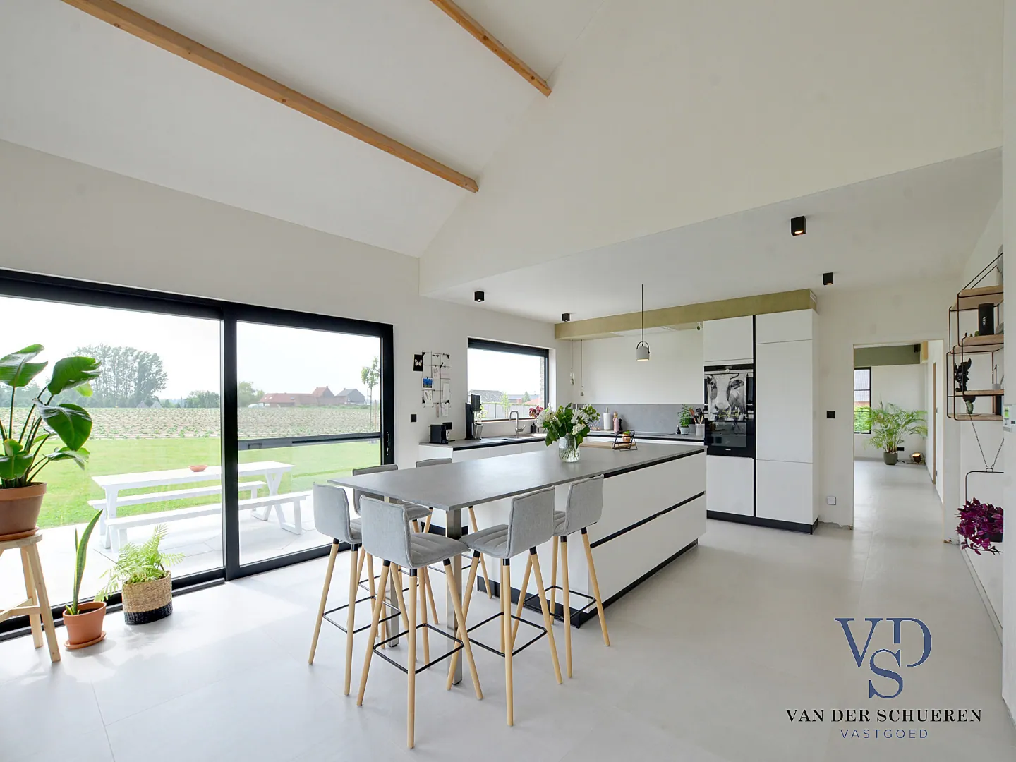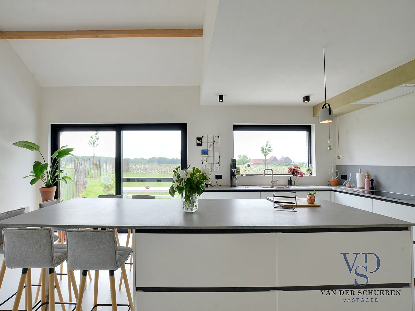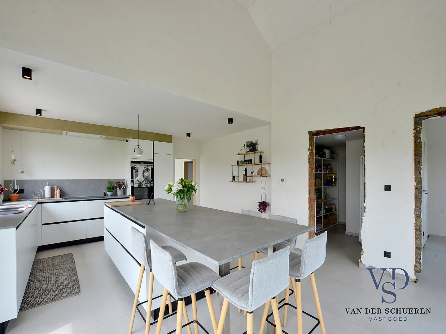 Conceptueel werd er een unieke symbiose gecreëerd tussen leefruimte en keuken, versterkt door het unieke, groene zicht door o.a. het bijna 50 m² terras (gepolierde beton).